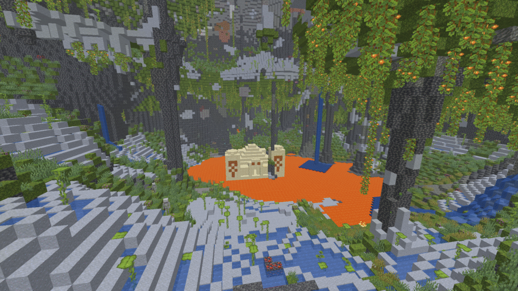 Aqui você terá cerca de 4 vilas próximas, sendo 2 dentro de um enorme lago, uma formação natural perfeita para se construir uma base próxima. Além disso, no fundo do lago, você terá spawns de mobs e uma câmara do julgamento.