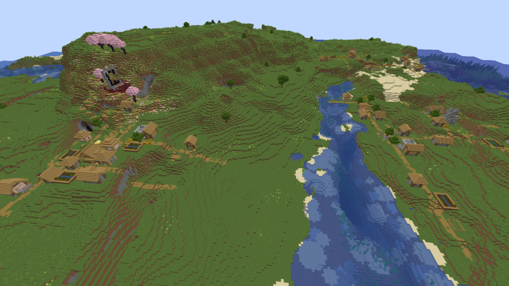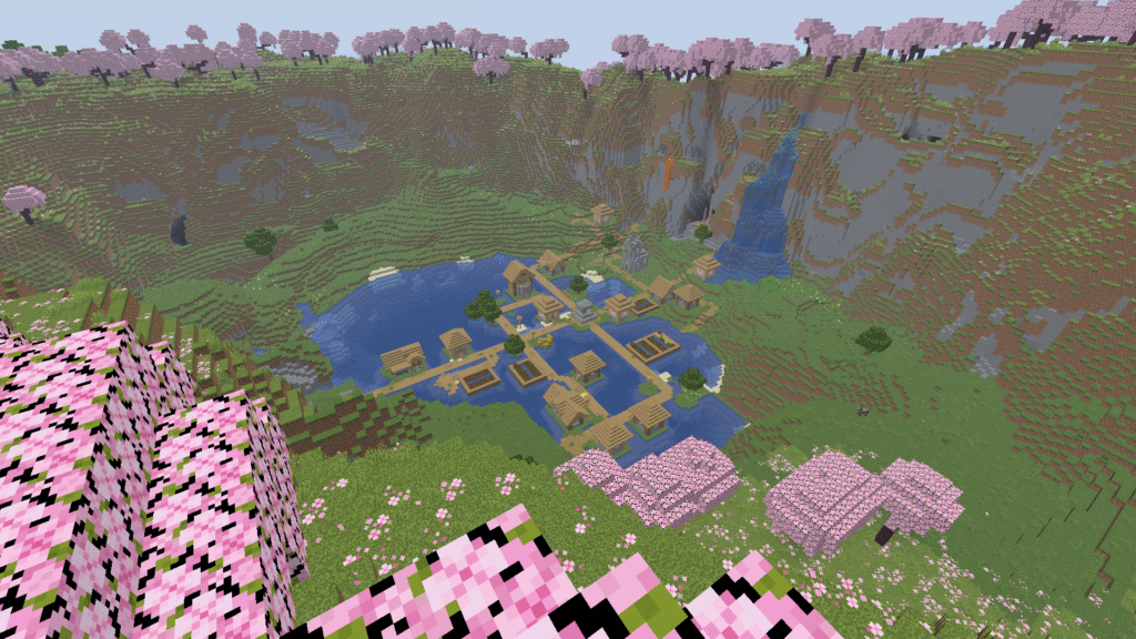 Aqui, você nascerá em um vale; na versão JAVA, haverá um portal próximo. Seguindo adiante, você encontrará outro vale com uma vila enorme dentro de um lago cercada por montanhas de cerejeiras. Essa seed é sem dúvida a melhor até agora! Na versão BEDROCK não haverá vila, mas o lago continuará lá!