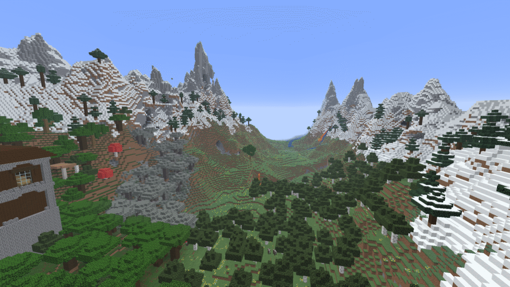 Aqui você terá cerca de 4 vilas próximas, sendo 2 dentro de um enorme lago, uma formação natural perfeita para se construir uma base próxima. Além disso, no fundo do lago, você terá spawns de mobs e uma câmara do julgamento.