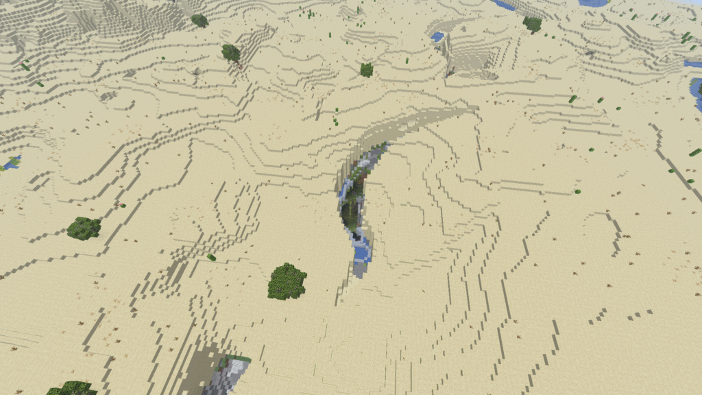 Aqui, você nascerá ao lado de uma ravina, dentro dela haverá um templo do deserto rodeado por um lago de lava, baita desafio para um início de jogo! Será que você consegue se aventurar nessa seed?