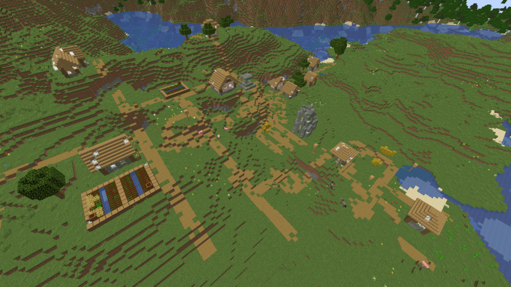 Nesta seed, você terá, não uma, não duas, nem três… Mas sim, QUATRO vilas abandonadas, todas próximas do spawn! Mas elas serão abandonadas apenas na versão JAVA; a mesma seed na versão BEDROCK terá apenas três vilas e todas estão povoadas.