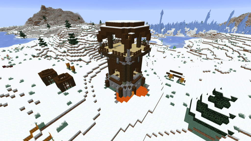 Nesta seed, você nascerá em uma vila totalmente coberta por neve em um bioma de muito gelo. É perfeita para um início de jogo, uma aventura logo de cara! Ao longe haverá um posto pillager, porém, se você for lá, seja rápido ao pegar o baú, pois este posto nasceu em cima de um lago de lava!