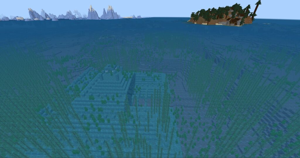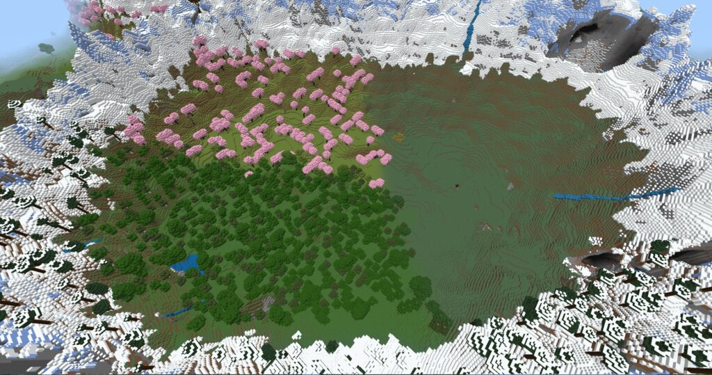 Aqui, você irá spawnar em um bioma de cerejeiras e, ao lado, haverá um bioma de gelo. Próximo ao spawn, haverá uma vila e, ao lado dessa vila, terá um monumento oceânico. Parece um ótimo lugar para se viver e construir uma base!