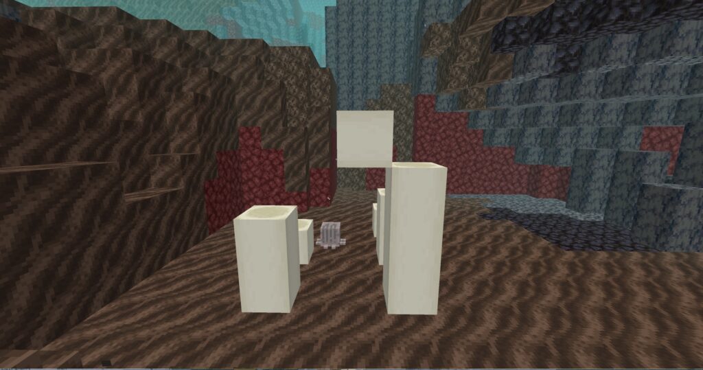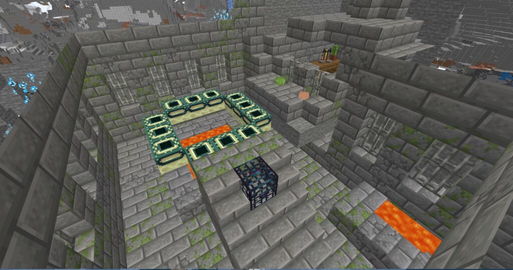 Nesta seed, um enorme BUG de estruturas: quase todas elas nasceram em um mesmo lugar, sendo uma vila, um portal em ruínas, um posto pillager, um naufrágio e até um iglu! Para melhorar, ao ligar o portal, você nascerá bem próximo de um spawn de ghast feliz!
