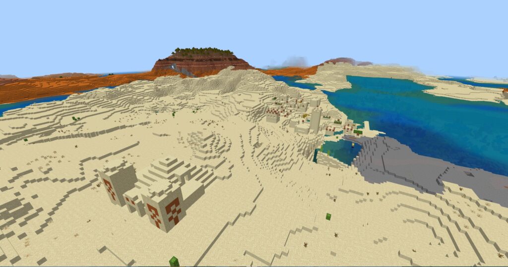 Uma aventura desértica é o que você procura? Aqui você terá um enorme deserto e um grande bioma de mesa, com uma vila e 2 templos próximos. Se você cavar para baixo no primeiro templo do deserto, na sala de baús, encontrará uma câmara dos desafios! Na versão BEDROCK, a vila não vai existir; haverá apenas um templo e a câmara dos desafios.