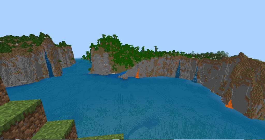 Nesta seed, você nascerá perto de uma enorme bug, uma vila numa ilha, misturada a um posto pillager. A visão é perfeita, uma boa seed para quem gosta de muita água!