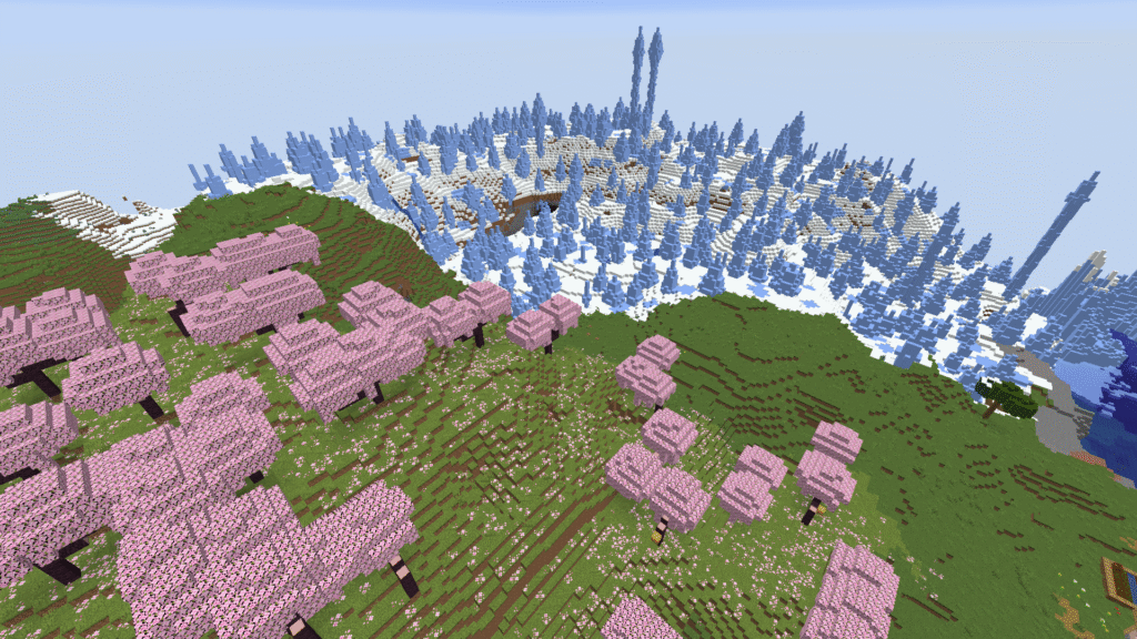 Aqui, você irá spawnar em um bioma de cerejeiras e, ao lado, haverá um bioma de gelo. Próximo ao spawn, haverá uma vila e, ao lado dessa vila, terá um monumento oceânico. Parece um ótimo lugar para se viver e construir uma base!