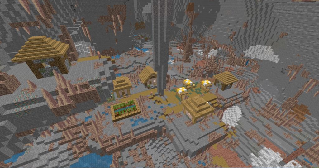 Nessa primeira seed, disponível para a versão BEDROCK, você terá uma vila logo no spawn, e, quando se der conta da beleza desse lugar, não irá mais querer escolher nenhuma outra seed. Na versão JAVA, a vila não aparece!